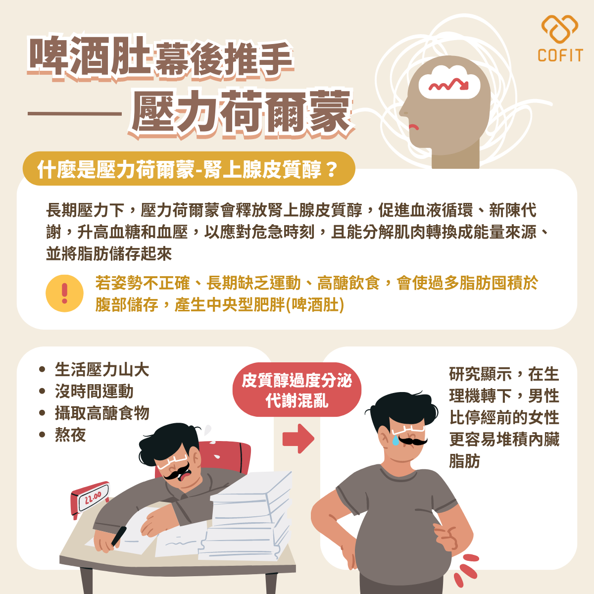 人類在面對壓力時,腎上腺會大量釋放皮質醇,而皮質醇會改變身體的能量儲存跟結構利用,長期處在壓力下,肌肉會逐漸流失,加上姿勢不正確、長期缺乏運動、睡眠不足,就會造成脂肪囤積,久而久之就容易形成