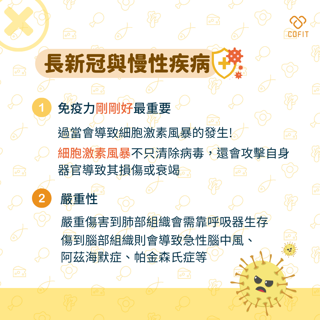 通常病毒會在患病後兩週內被消滅,而長新冠它可以持續那麼久並不是病毒本身太厲害,而是我們的免疫系統過度反應而造成的,也就是所謂的細胞激素的風暴,一般我們稱為免疫風暴。簡單來講當病毒進到體內,免疫系統會想辦法要清除它,而清除病毒時則需要過氧化物質及發炎的介質。免疫過當時,細胞激素風暴不只會清除病毒,還會攻擊自身的器官,導致器官損傷或衰竭。若傷害到肺部組織,嚴重可能會導致需要靠呼吸器來生存;傷害到腦部组織則會導致急性腦中風、阿茲海默症、帕金森氏症等。