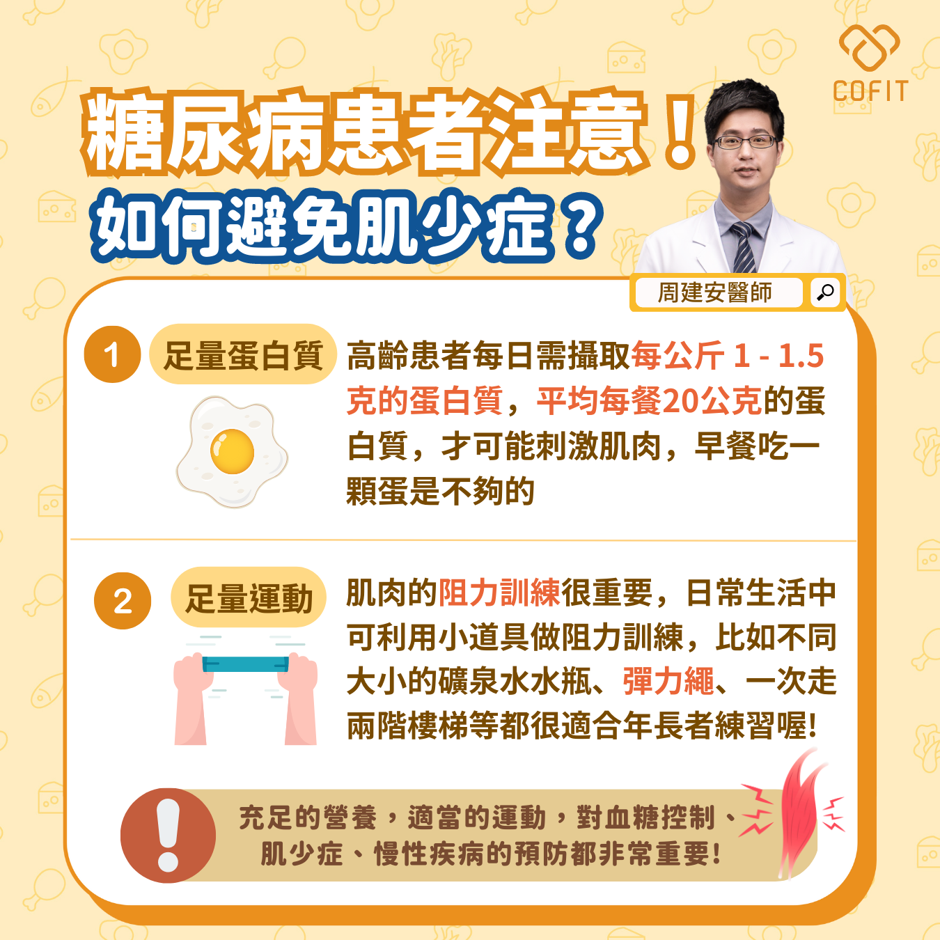糖尿病患者常需要控制飲食,限制攝取的碳水化合物和糖分。然而,過度的飲食控制可能導致身體無法獲得足夠的營養素,特別是蛋白質和其他重要的養分。這可能導致營養不足,進而影響肌肉的健康和功能喔!