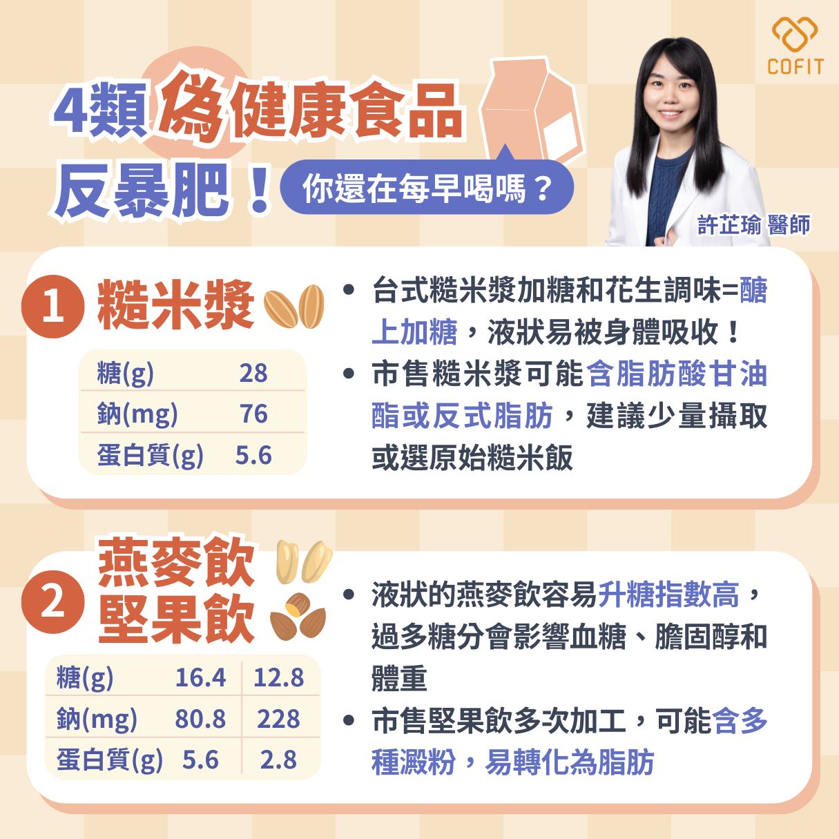 - 液體狀的燕麥飲容易升糖指數高,過多糖分會影響血糖、膽固醇和體重