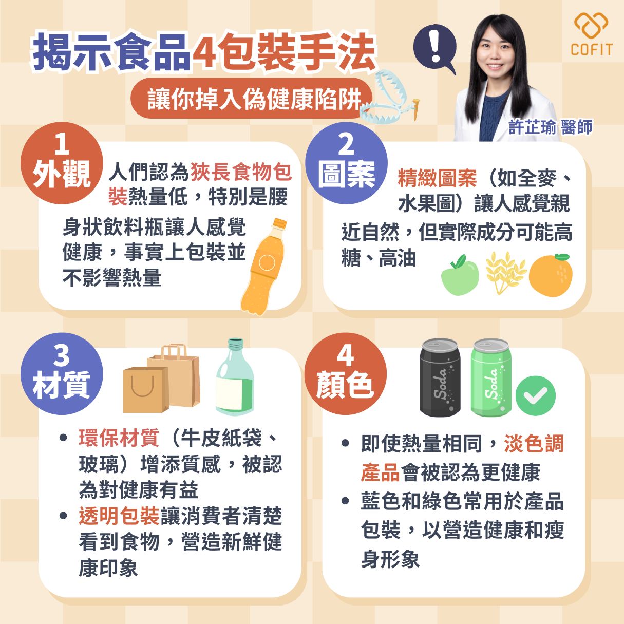 (如全麥、水果圖)讓人感覺親近自然,但實際成分可能高糖、高油。