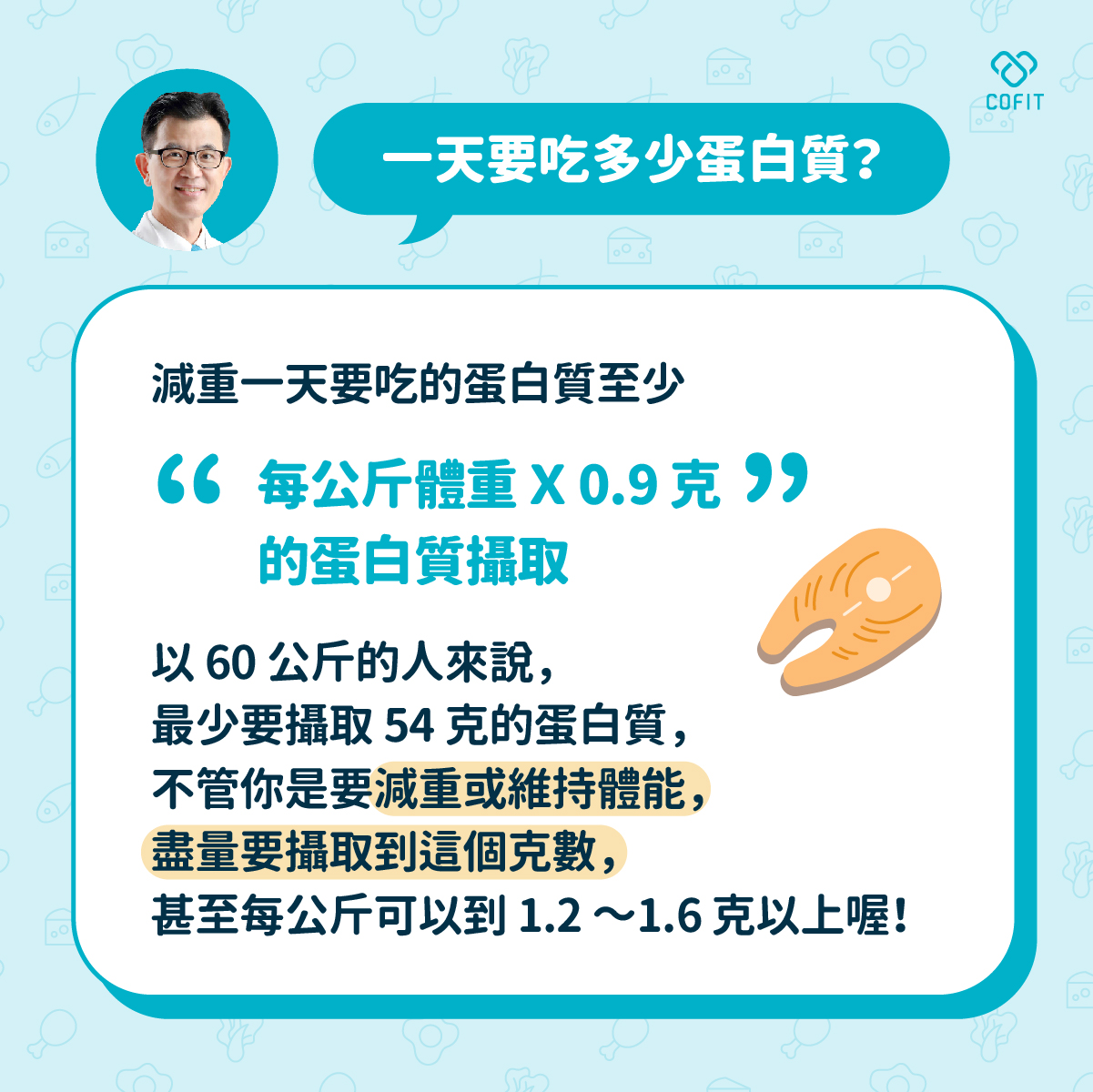 一般建議每日攝取的蛋白質量為每公斤體重乘以0.9克