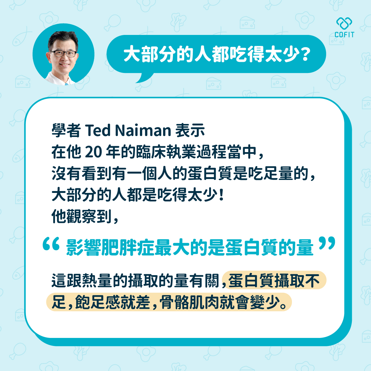 美國的奈曼醫師在二十年的臨床實踐中觀察到,很少有人攝取足夠的蛋白質,大部分人的蛋白質攝取量偏低。他指出蛋白質攝取的量對肥胖症的影響最為顯著。蛋白質攝取不足會使飽足感降低,並導致骨骼肌肉減少,相對脂肪比例增加,