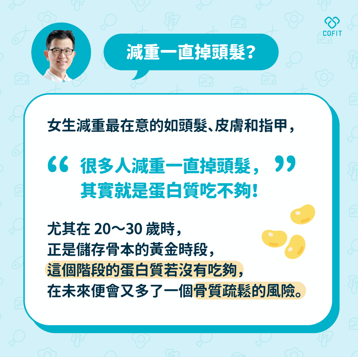 此外,若減重過度,甚至可能出現掉髮情況,這其實是蛋白質攝取不足的表現。
