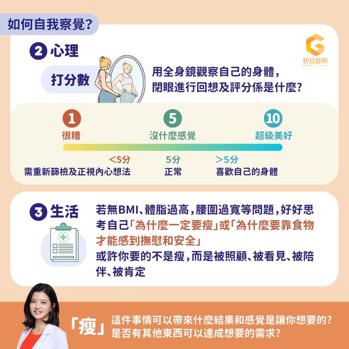 找一面全身鏡,從頭到腳觀察自己的身體,閉眼進行評分(1-10分)