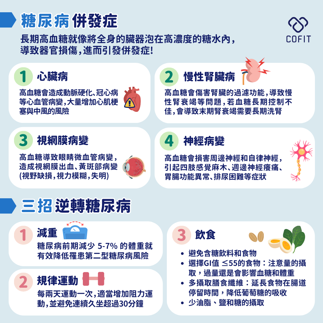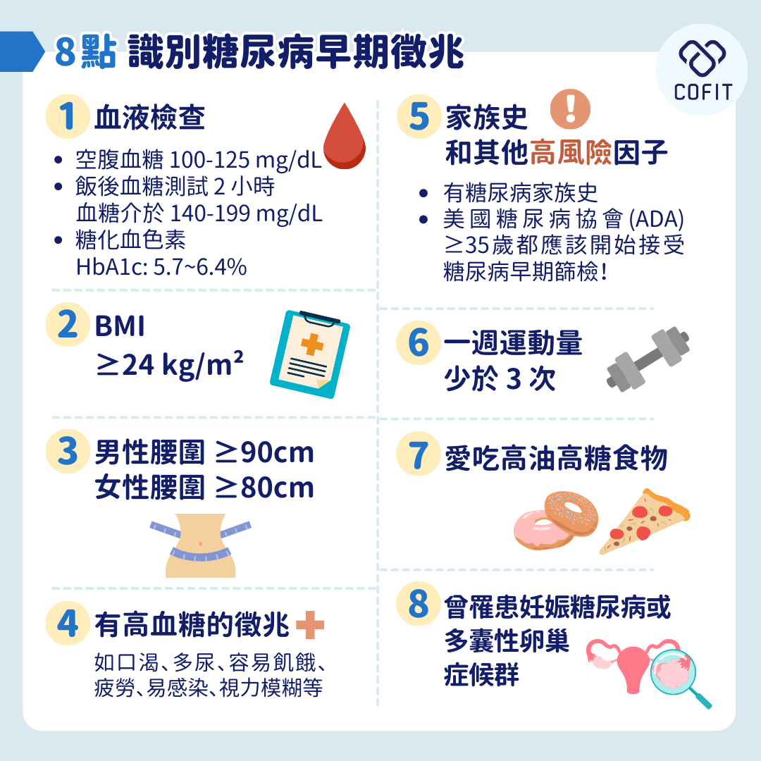 1.減重:根據研究,針對糖尿病前期的人群,減少 5%-7% 的體重可以有效地降低發展成第二型糖尿病的風險。同時基於腰圍與腹部脂肪堆積與糖尿病風險之間的關聯性,建議男性腰圍維持在90cm以下;女性腰圍維持在80cm 以下。
