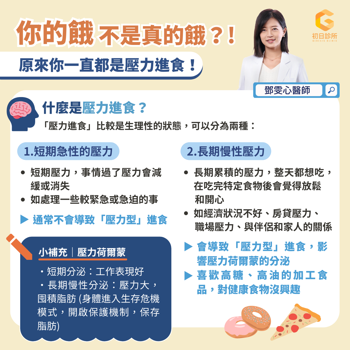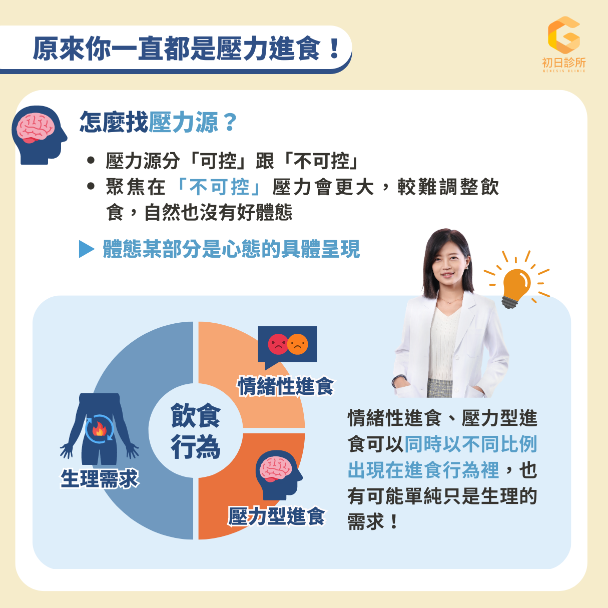,壓力源包括經濟、職場、伴侶和家庭,吃完特定食物後會覺得放鬆舒壓,除了心理影響,還有壓力荷爾蒙的分泌,會讓人容易餓、傾向攝取高糖、高油的加工食品、也更容易囤積脂肪。