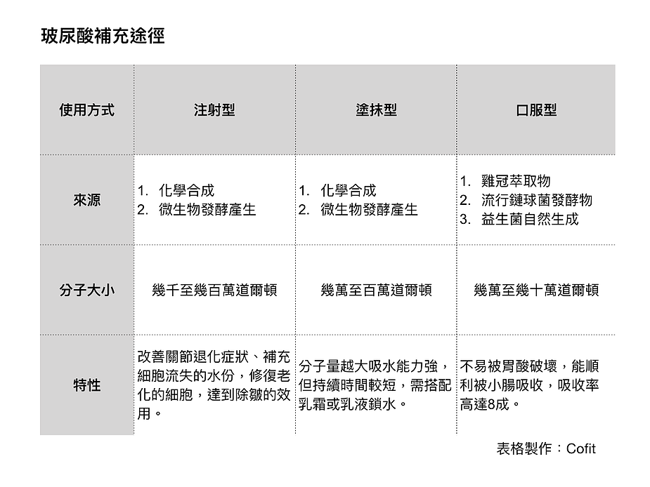 玻尿酸補充途徑很多種,大家可以依照自己的需要做補充的選擇: