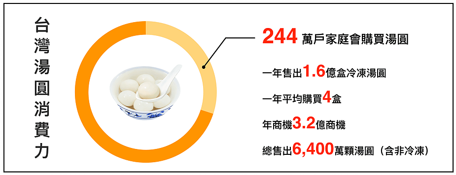 台灣人一年吃掉6,400萬顆的冷凍湯圓 凱度消費指數指出,全台灣有高達 260 萬的家庭會購買冷凍湯圓,一年平均會購買到 4 盒,根據尼爾森調查,台灣冷凍湯圓商機高達 3.2 億台幣,以售價換算相當於每年可以吃掉 6,400 萬顆冷凍湯圓,有調查更指出這樣就賣出了 1.6 億顆盒裝湯圓,而且這僅僅是盒裝湯圓,並無包括市場的手工湯圓數量,顯示台灣人非常熱愛吃湯圓。吃湯圓的習慣最主要在冬至及元宵節,因此購買高峰也是聚集在此。尤其是冬至即將來臨,前後兩週正是最多人選購的時機,相較於平日銷售額可衝高 10 至 15 倍之多,對於市場小攤飯來說,購買人潮甚至可以到達平日的20倍以上!