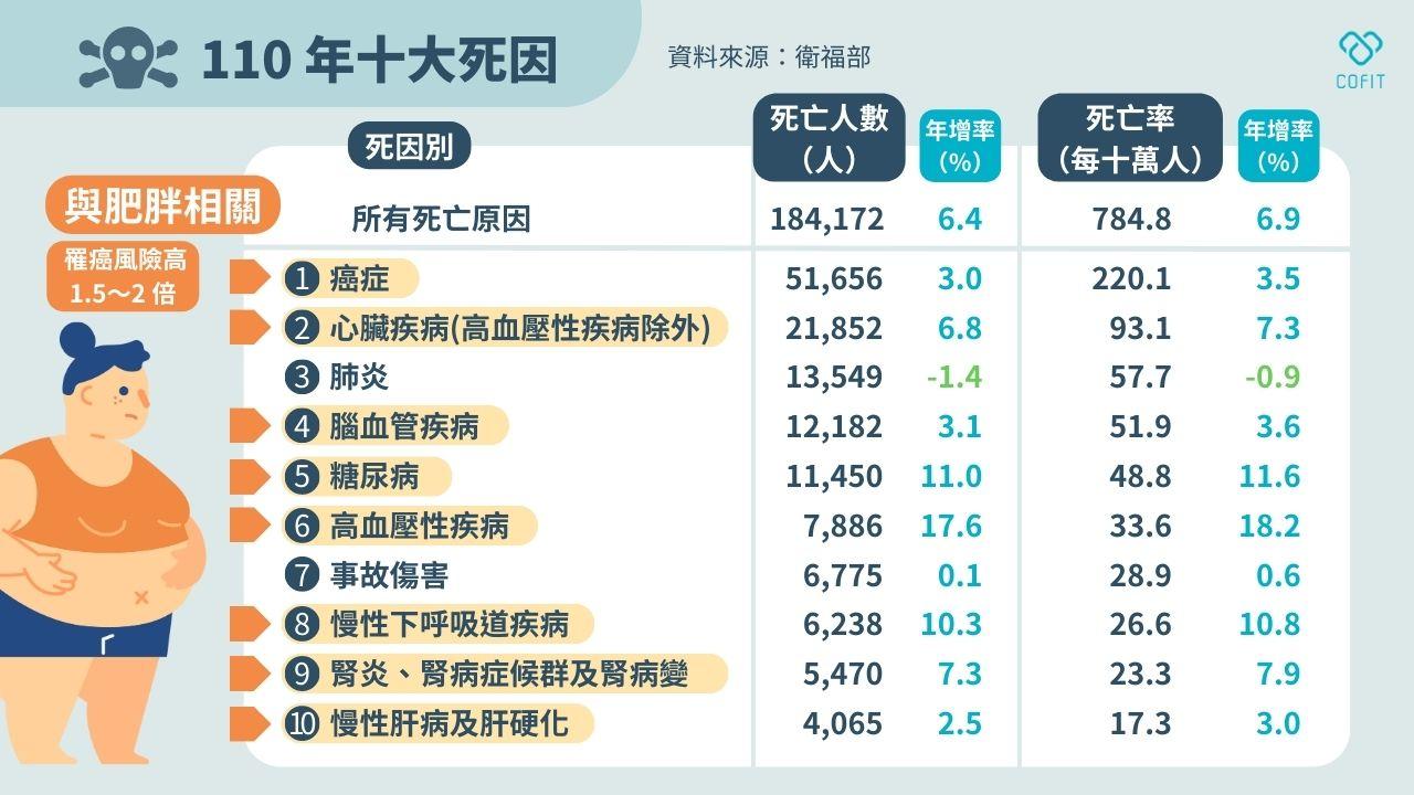肥胖雖然沒有出現在台灣國人十大死因中,但是肥胖卻和其中的8項成正相關,也就是肥胖會增加罹患這些疾病的機率。那8項分別是:惡性腫瘤(大腸癌、乳癌、子宮內膜癌)、心臟疾病、腦血管疾病、糖尿病、慢性下呼吸道疾病、慢性肝病及肝硬化、高血壓性疾病、慢性腎臟病等。甚至美國的研究顯示,肥胖的族群罹癌的機率比一般人高1.5倍,在肝癌和腎臟癌中甚至會高達2倍。