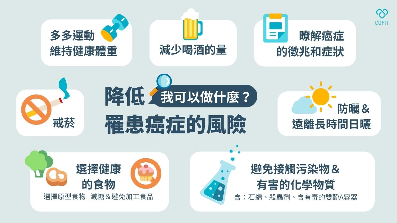 癌症雖然讓人聞風喪膽,但是有三分之一的癌症是可以預防的,只要避免抽菸、喝酒等不良習慣,以及最重要的:維持健康的體重,養成健康的生活習慣。最快速可以鑑定自己有沒有過重的方法便是計算BMI。當BMI≧24表示體重過重,BMI≧27為肥胖,BMI高於這些數值的時候就要多加注意了喔。